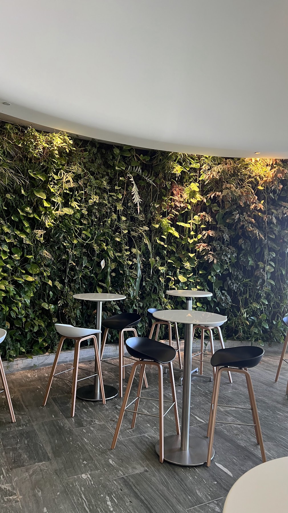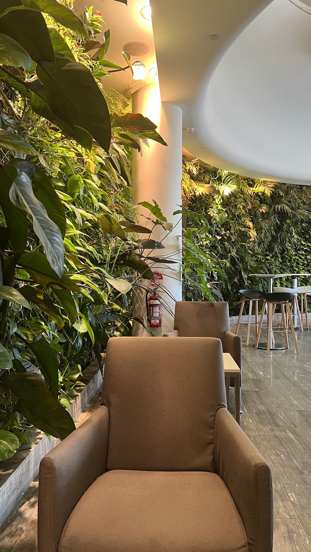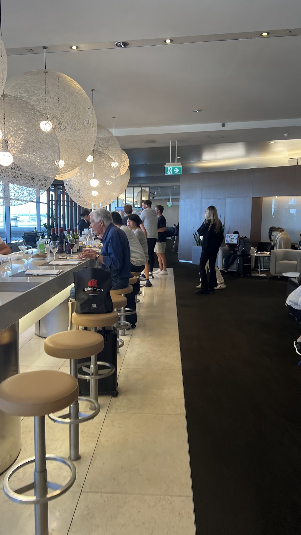 We didn’t take many photos because it was so crowded, but we ended up spending most of our time in the overflow seating section that extends beyond an emergency exit door. This area sits underneath the Qantas International First Lounge above — you can tell because the leafy wall décor is actually part of the First Lounge’s design.