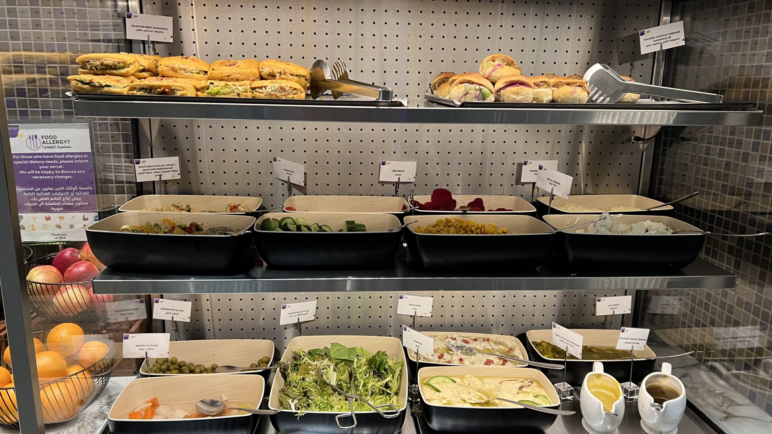 Food offerings focus mainly on Middle Eastern cuisine, cold salads, desserts, and a selection of drinks.